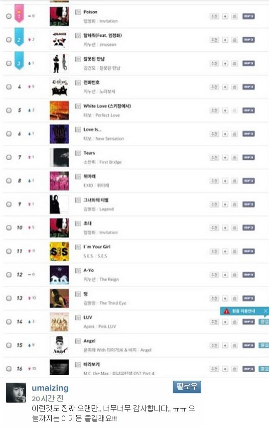 해당 갈무리 화면에는 포이즌 외에도 지누션의 <말해줘>, 김건모의 <잘못된 만남>등이 순위에 올랐다.