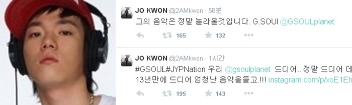 그룹 2AM 조권은 9일 SNS를 통해 "마침내 지소울이 돌아왔다"며 "13년 만에 드디어 엄청난 음악을 들고! 그의 음악은 정말 놀라울 것이다"라고 글을 남겨 눈길을 끌었다.