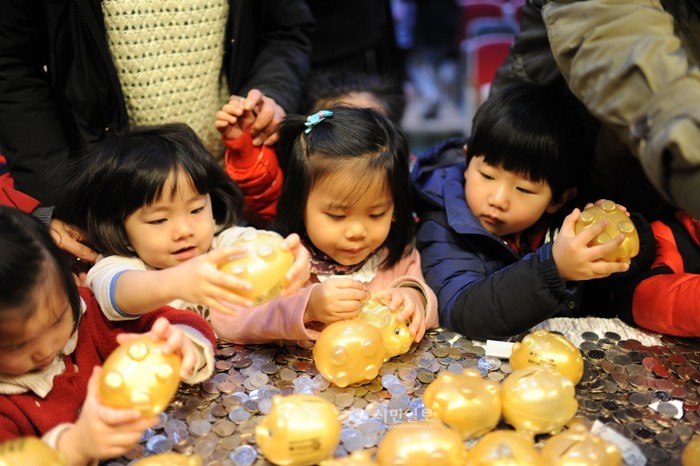 20일 오전 서울 중랑구청 지하대강당에서 개최된 중랑구 가정어린이집연합회 '2015년 사랑의 동전 전달식'에 참여한 원아들이 한 해 동안 모금한 저금통을 기부하고 있다. 이날 전달식은 성금과 쌀 20kg 100포(450만 원 상당)가 함께 전달됐다.(사진제공=중랑구청)