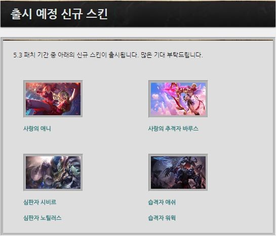 이번 롤 점검에서는 발렌타인 데이를 앞두고 발렌타인 기념 스킨이 추가될 가능성이 높아 유저들의 기대를 모으고 있다.