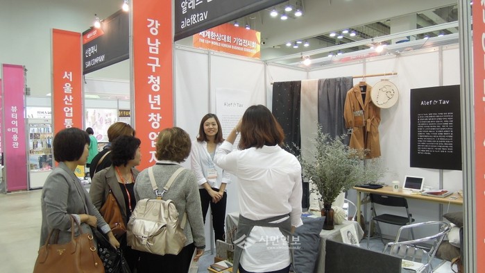 | ▲ 중소기업청의 주최로 개최된 '제13차 세계한상대회 기업전시회'에 참가한 한 청년기업이 자신들이 개발한 상품을 소개하고 있다. (사진제공=강남구청) | ||