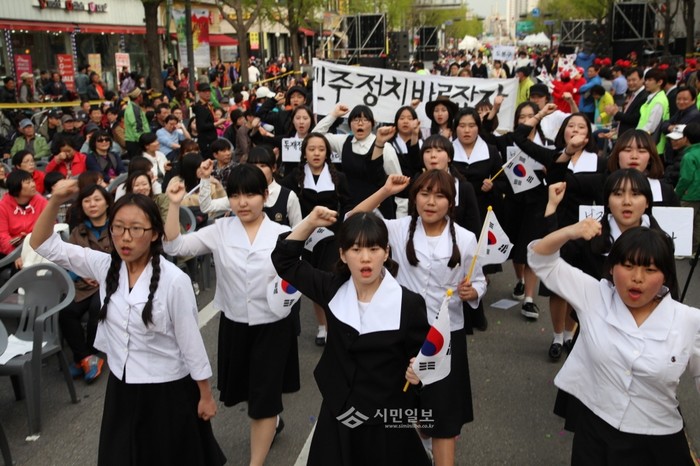 지난 19일 서울 강북구에서 4.19혁명 제55주년을 기념하는 '4.19혁명 국민문화제 2015'가 열렸다. 사진은 1960년대 거리재현 퍼레이드에 참여한 학생들이 당시 민주화시위를 재현하고 있는 모습. (사진제공=강북구청)