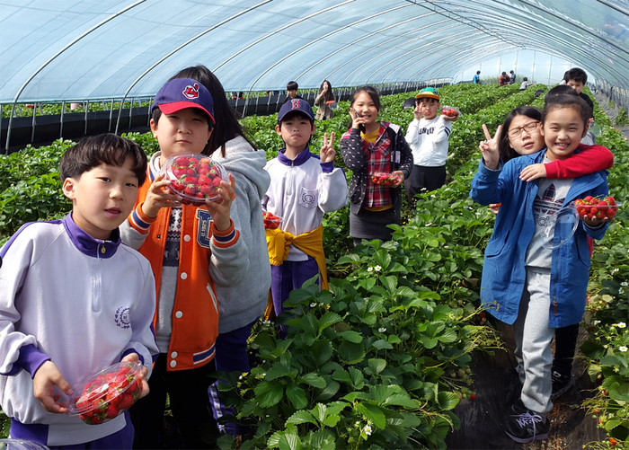 경북 구미 비산초등학교 5학년 학생들이 최근 딸기 농장에서 친환경 딸기 따기 체험을 실시했다. 사진은 이날 참여 학생들이 직접 딴 딸기를 들고 기념촬영한 모습. (사진제공=구미시청)