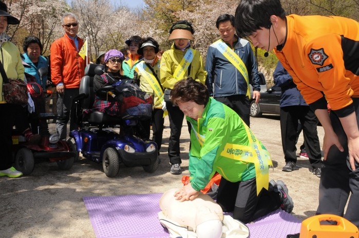 서울 서대문소방서가 최근 서대문구 홍은1동 홍록배드민턴장에서 중증장애인 북한산 자락길 산행에 앞서 심폐소생 교육을 실시했다. 사진은 이날 행사에 참여한 자원봉사자가 심폐소생술을 배우고 있는 모습. (사진제공=서대문소방서)
