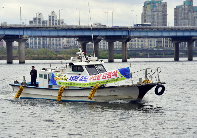 20일 오후 서해 5도 어선이 경인 아라뱃길을 거쳐 서울 한강 여의도 임시선착장으로 들어오고 있다. 서해5도어민회와 서해아라뱃길정책추진단이 추진한 이번 행사는 북한의 위협과 관광객 감소로 생계에 어려움을 겪는 서해 5도 어민들을 돕고 서해 5도와 한강을 잇는 물길을 열고자 마련됐다.