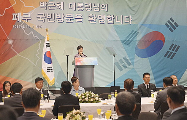 박근혜 대통령이 19일 오후(현지시각) 페루 리마 시내 한 호텔에서 열린 동포 만찬간담회에 참석, 인사말을 하고 있다.