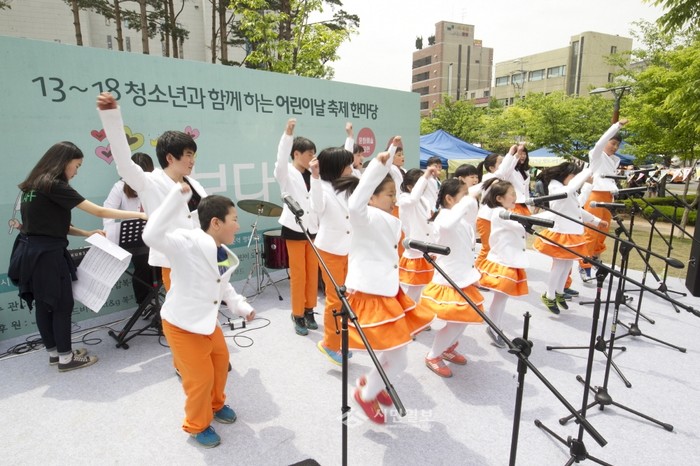서울 은평구가 최근 역촌 평화공원에서 청소년과 함께하는 어린이날 축제 한마당 '꽃보다 우리'를 개최해 어린이들이 무대에 올라 공연을 펼치고 있다. (사진제공=은평구청)