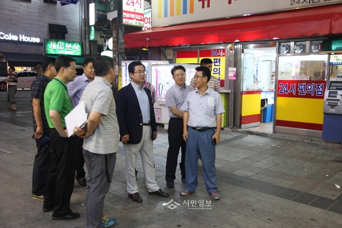 박흥식 경기 수원시 팔달구청장은 지난 17일 안전건설과장 등 관련 부서장들과 함께 수원역 테마거리, 나혜석 거리를 방문해 야간현장을 점검했다. 사진은 박흥식 구청장(가운데)이 관계자들과 대화하고 있는 모습.(사진제공=팔달구청)