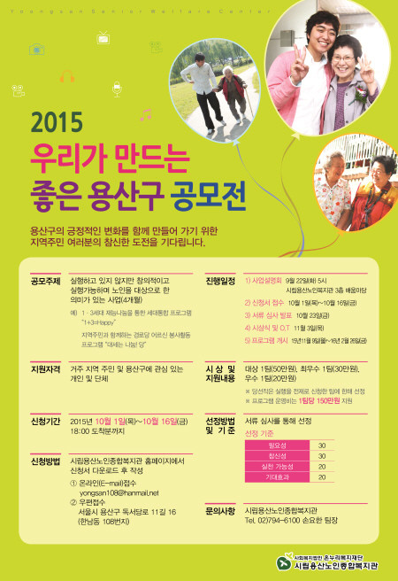 용산노인종합복지관은 선정된 사업에 대해서는 오는 11월~ 2016년 2월 실제로 사업을 진행 할 수 있는 기회를 제공한다.