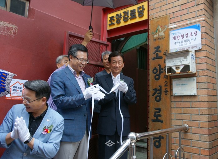 성장현 서울 용산구청장(가운데)이 최근 조양경로당에서 열린 '제1호 개방형 경로당 현판식'에 참석해 진영 국회의원(오른쪽)과 함께 축하하고 있다. 개방형 경로당으로 선정된 조양경로당은 앞으로 라인댄스, 노래교실 운영을 통해 주민들에게 개방될 예정이다. (사진제공=용산구청)