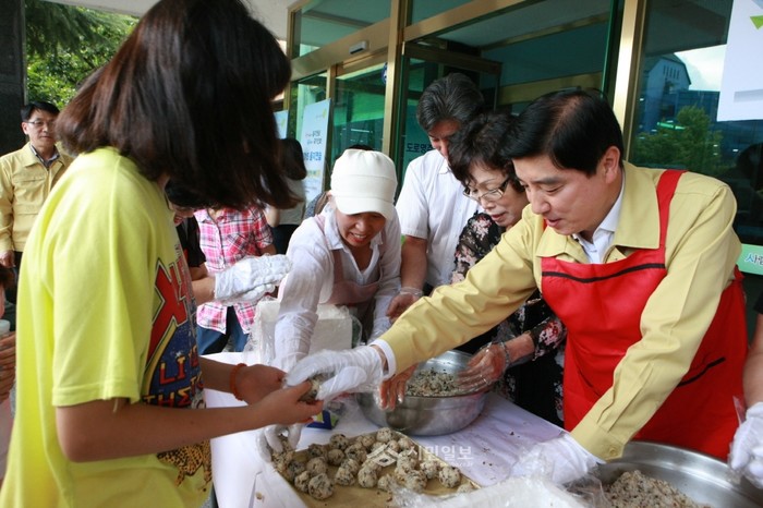 지난 18일 서울 강동구청 로비에서 열린 '6.25 전쟁음식체험 2015 을지연습 주먹밥 시식회'에 참석한 이해식 구청장(오른쪽)이 직접 주먹밥을 만들어 주민들에게 나누어 주고 있다. (사진제공=강동구청)