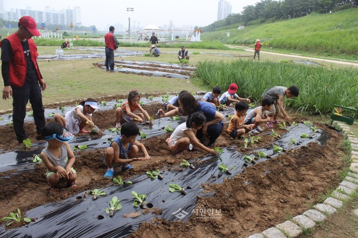 지난 19일 서울 구로구가 지역내 어린이들을 대상으로 안양천 자연학습장에서 실시한 친환경 농촌체험 행사에 참가한 아이들이 교사와 함께 배추 모종을 심고 있다.(사진제공=구로구청)