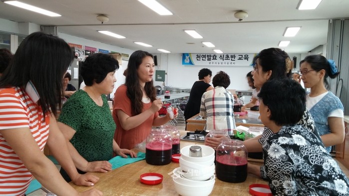 경기 광주시농업기술센터가 최근 센터 생활과학실습실에서 주민 25명을 대상으로 '천연발효 식초반' 교육을 실시한 가운데 참여자들이 직접 과일·곡물 발효식초를 만들고 있다.(사진제공=광주시청)