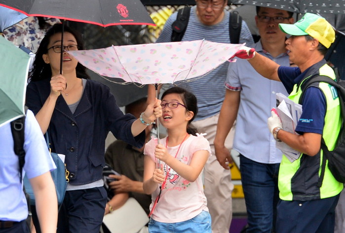 제15호 태풍 ‘고니(GONI)’의 영향으로 전국 대부분 지역에 비가 내린 25일 오전 서울 종로구 세종로에서 한 아이의 우산이 강한 바람에 뒤집히고 있다./뉴시스