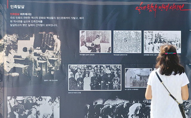 30일 오전 서울 종로구 광화문 북측광장에서 열린 광복 70년 기념 한·중 일제침략만행 사진 광화문 특별전에서 시민들이 일본군의 만행이 담긴 사진을 둘러보고 있다.