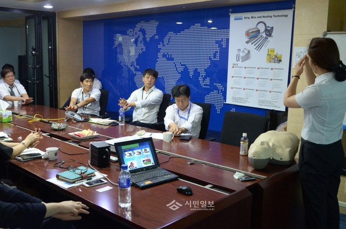 서울 영등포소방서는 지난 1일 오후 여의도동에 위치한 한국샌드빅 관계자들을 대상으로 화재발생시 행동요령과 심폐소생술에 대한 소방안전교육을 실시해 참여자들이 소방대원을 바라보며 심폐소생술 손동작을 따 배워보고 있다.(사진제공=영등포소방서)