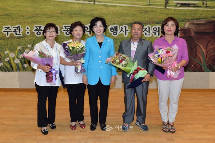 박춘희 서울 송파구청장(가운데)이 지난 1일 풍납2동 토성초등학교 체육관에서 동민의 화합과 자긍심 고취를 위해 열린 '제4회 풍납2동민의 날'에 참석해 표창장을 받은 동민들과 기념촬영을 하고 있다.(사진제공=송파구청)