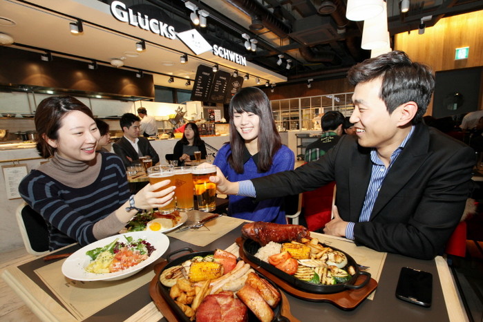 | ▲ 서울 강남역 인근 그릭슈바인 SPC스퀘어강남점을 찾은 직장인들이 정통독일식 요리와 맥주를 즐기고 있다. 그릭슈바인은 삼립식품이 운영하며 정통 독일식 육가공 요리와 독일맥주를 제공한다. | ||