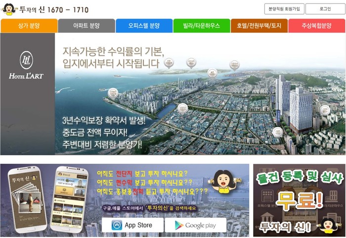 그 중 어플 ‘투자의 신’은 전국에서 분양하는 모든 분양 물건을 한 눈에 보고 비교가 가능하도록 만들어졌다. 아파트 투자, 수익형 호텔 투자, 오피스텔 투자, 상가 투자, 빌라 투자, 타운하우스 투자, 전원주택 투자 등 부동산 투자를 할 때는 부동산 분양정보 어플인 ‘투자의 신’에서 한 번에 해결할 수 있다.