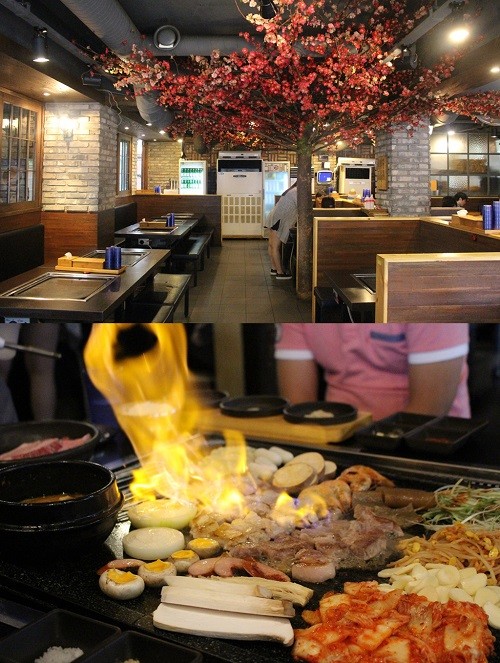 이 곳에선 26인치 대형 돌판을 버섯•새우•파인애플•마늘•김치•고구마•떡•콩나물•양파치즈계란후라이•돼지껍데기 등 다양한 먹거리와 고기로 가득 채운 비주얼과 돌판 위에서 노릿노릿 익어가는 고기 내음에 화사한 매화나무로 인테리어 된 고즈넉한 분위기로 시각과 후각을 먼저 만족시킨다.