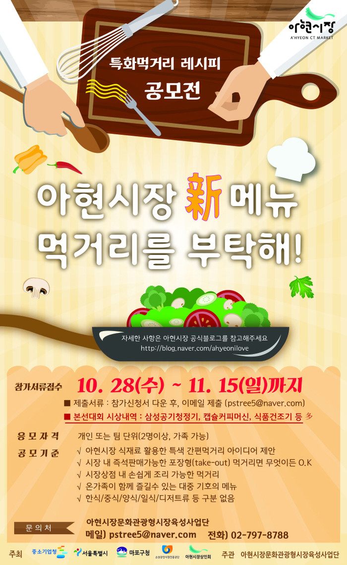이번 대회는 전통시장 상권 활성화 및 신메뉴 발굴, 활용 모색을 위한 행사의 일환으로, 아현시장 및 시장 먹거리 음식에 관심이 있는 개인/단체팀 누구나 응모 가능하다.