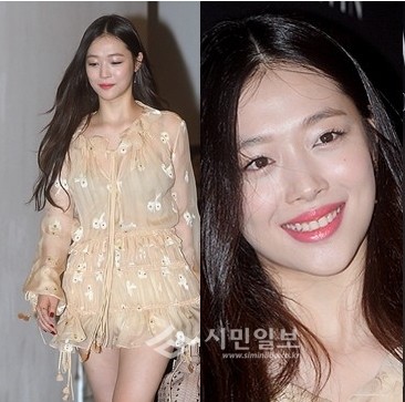 이 날 설리는 누드톤의 쉬폰 소재 원피스를 입고 입장하고 있다.