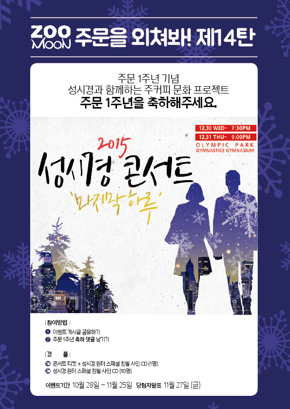 주커피는 주문 프로젝트 1주년을 축하하기 위해, 성시경의 연말 콘서트 ‘마지막 하루’의 티켓·성시경의 스페셜 앨범 <Winter Wonderland> 친필 사인CD를 증정하는 이벤트를 진행한다. 이벤트 참여방법은 주커피 페이스북의 이벤트 게시글을 공유하고 주문 1주년 축하글을 이벤트 게시물 댓글에 남기면 된다. 이벤트는 11월25일까지 진행되며 당첨자는 27일에 발표된다.