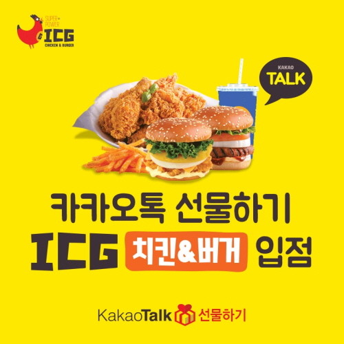 ㈜푸디노에프앤디가 운영하는 ‘ICG치킨앤버거’가 지난 13일 ‘카카오톡 선물하기’ 코너에 입점했다. 이제 카카오톡 선물하기를 통해 편리하게 ICG치킨앤버거의 메뉴를 모바일상품권으로 구입하고 사용(일부 매장 제외) 할 수 있게 된 것,