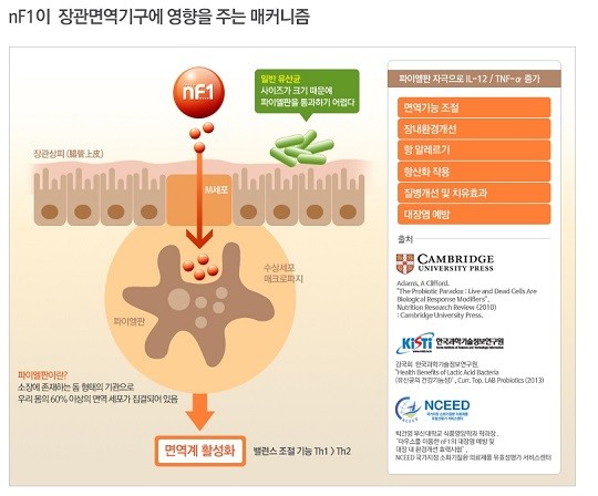 즉 김치에서 튼튼하고 강한 균만을 추출하여 열처리 공정을 거친 유산균 제제인 nF1을 커피, 분유, 아로니아제품, 음료, 스낵류 등 식품에 첨가를 하게 될 경우 유산균의 기능을 발휘해 면역성을 높일 수 있다는 의미다.