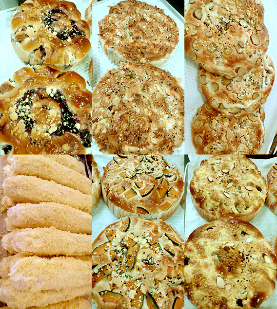 | ▲ 왼쪽 상단부터 시계방향으로 블루베리크림치즈, 코코넛빵, 호두고구마빵, 생크림빵, 웰빙호두단호박빵, 호두브레드 | ||