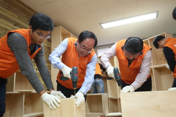 | ▲한화건설 최광호 대표이사(왼쪽 두번째)가 꿈에그린 도서관 50호점 사회봉사활동에 참가해 책장을 제작하고 있다. | ||