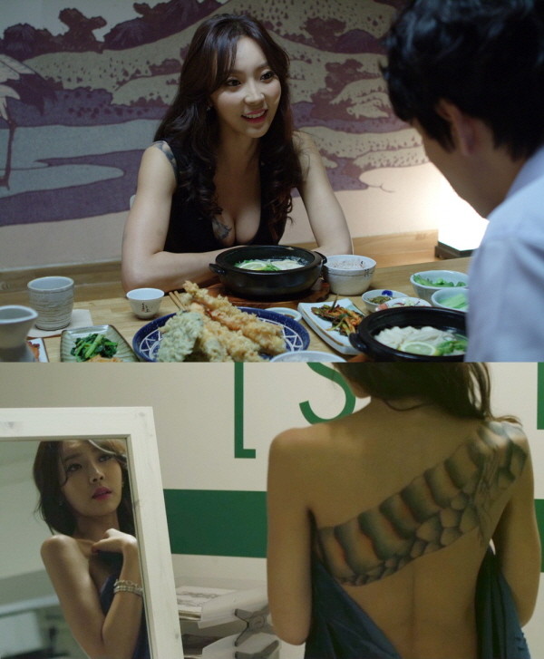 타투이스트 수나(윤주희 분)에게 타투 시술을 받는 구찌의 목부터 어깨, 등, 어엉이를 타고 흐르는 섹시하고 파격적인 드래곤 전신 타투를 확인한 관객들은 놀라움을 감추지 못하고 있다.