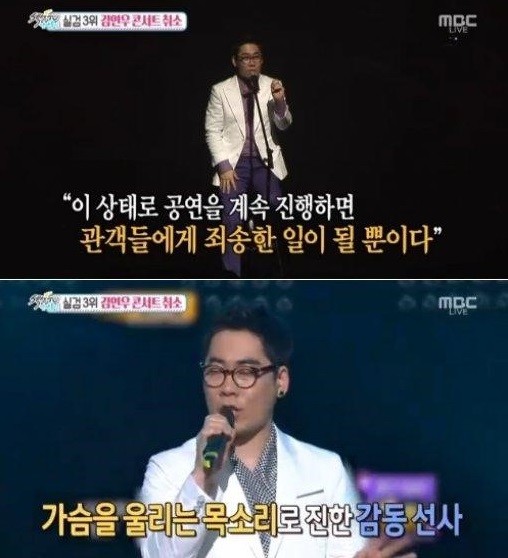 앞서 김연우는 12일 천안 콘서트 중 "고음이 올라가지 않는다. 20년 동안 이런 일은 처음이다"라며 공연을 중단했고, 콘서트장 출구로 나와 관객과 일일이 악수를 하며 사과의 뜻을 밝혔다.