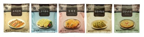 제품구성은 계란 옷을 입혀 부쳐낸 생깻잎전, 국내산 돼지고기로 만든 고기완자, 고소한 녹두를 갈아 만든 녹두전, 꼬지가 없어 위생적인 오미산적, 수제 동태포에 계란 옷을 입힌 동태전 그리고 전자레인지 5분으로 만드는 한끼잡채 2팩 까지 총 11팩이다.