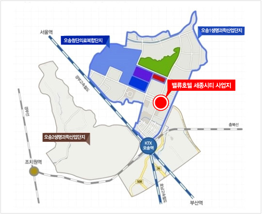‘밸류호텔 세종시티’가 들어서는 세종시의 관문인 충북 청주 오송은 호텔이 부족한 지역 중 하나로 CJ제일제당, LG생명과학, 한화 등 국내 대기업들과 대웅제약, 삼진제약 등 국내의 대표적인 제약회사들, 샘표식품, 메타바이오메드 등 약 60여개의 기업들이 밀집해 있다.