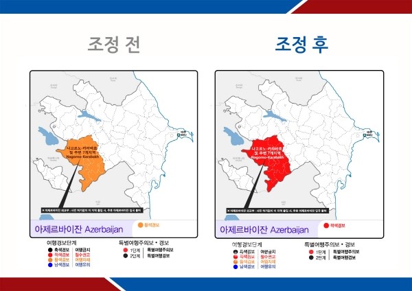 외교부에 따르면 이같은 조치는 지난 2일 나고르노-카라바흐 지역에서 무장 충돌이 계속되고 있고 향후에도 산발적인 교전이 계속될 가능성이 있어, 아제르바이잔을 방문·체류하는 우리 국민들의 신변안전 및 관심과 주의를 제고하기 위한 목적에서다.