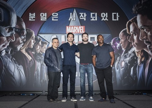 22일 오전(현지시간) 싱가폴 마리나 베이 센즈 컨벤션 센터에서는 영화 '캡틴 아메리카:시빌 워' 한국 기자간 기자회견이 열렸다. 이 자리에는 조 루소 감독, 크리스 에반스, 안소니 미키, 세바스찬 스탠이 참석했다.