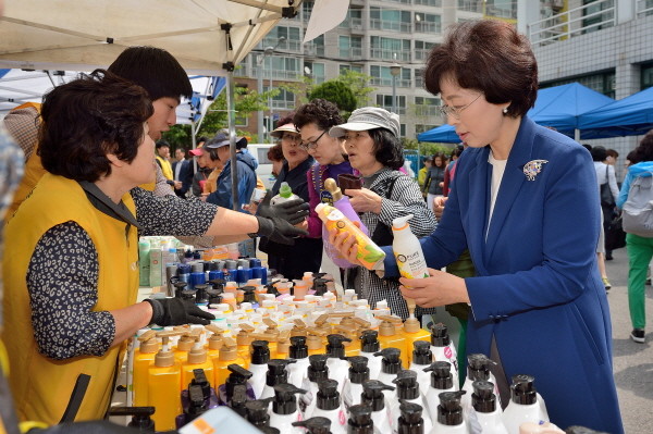 | ▲ 박춘희 송파구청장이 ‘사랑나눔 알뜰바자회’에 참석해 주민들과 함께 행사물품을 둘러보고 있다. | ||