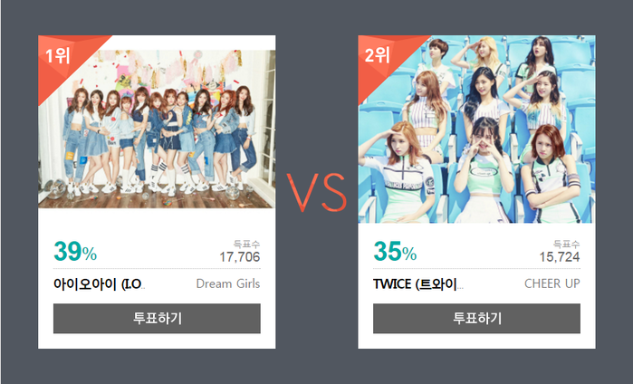 10일 오후 3시 현재 주간인기상 투표진행 상황을 보면 아이오아이는 1만7000여표를, 트와이스는 1만5000여표를 각각 획득했다. 비율로 보면 아이오아이가 39%, 트와이스가 35%를 각각 차지해 아이오아이가 앞서고 있는 상황이다.