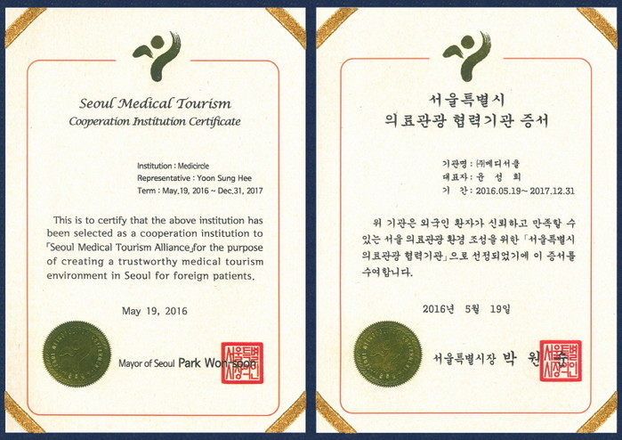 | ▲ 메디서클 서울의료관광 협력기관 증서 | ||
