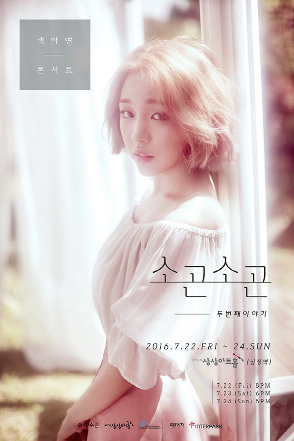 백아연은 오는 7월 22일부터 24일까지 3일간 총 3회에 걸쳐 서울 강남구 삼성역 인근에 위치한 KT&G 상상아트홀에서 두 번째 단독 콘서트 "'소곤소곤' 두 번째 이야기"를 개최한다.