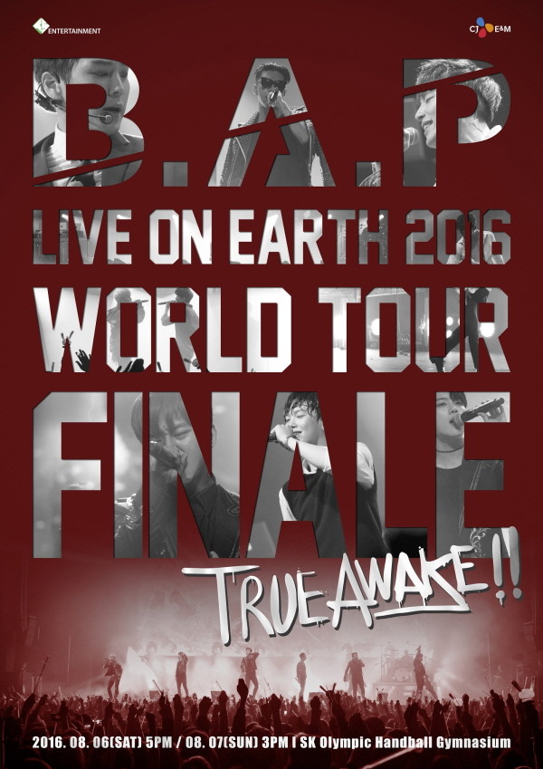 B.A.P는 20일 4대륙 16개국 30회에 걸친 월드투어 대장정의 마지막을 모국에서 장식하기로 결정하면서 'B.A.P LIVE ON EARTH 2016 WORLD TOUR FINALE TRUE AWAKE!!'의 메인포스터를 선보였다.