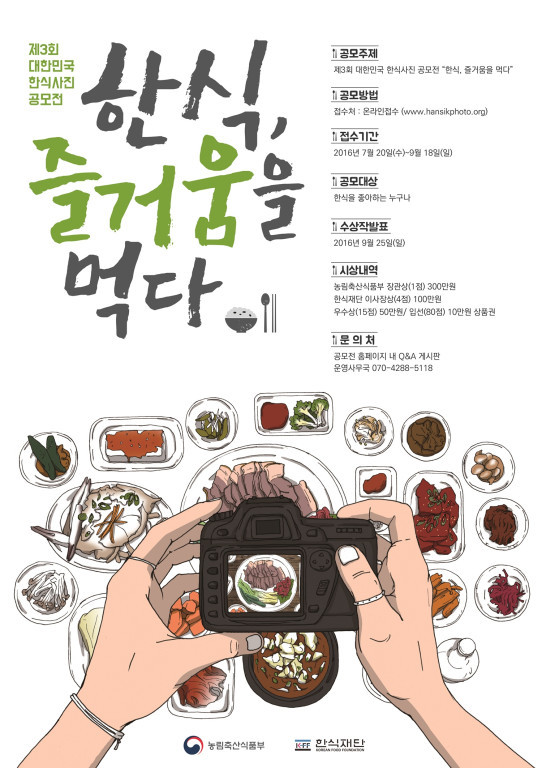 당선작 발표는 오는 9월25일 대한민국 한식사진 공모전 사이트를 통해 발표하며, 시상식은 9월 30일에 진행할 예정이다.