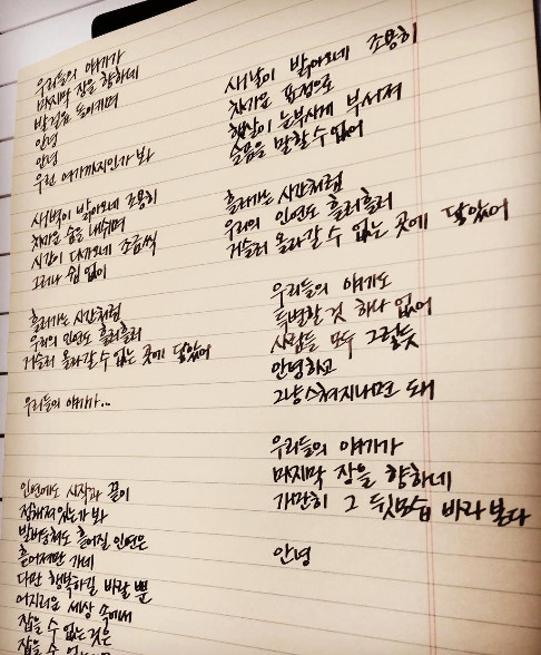 이를 본 네티즌들은 "아, 나만 알고싶은 언니(mys****)" "글씨 잘 쓰시네요(alslt****)" "왠지 슬픈 이 느낌은 뭘까요?(_violetM****)" "가사가 저의 마음을 대변해주네요(banana****)"등의 반응을 보였다.