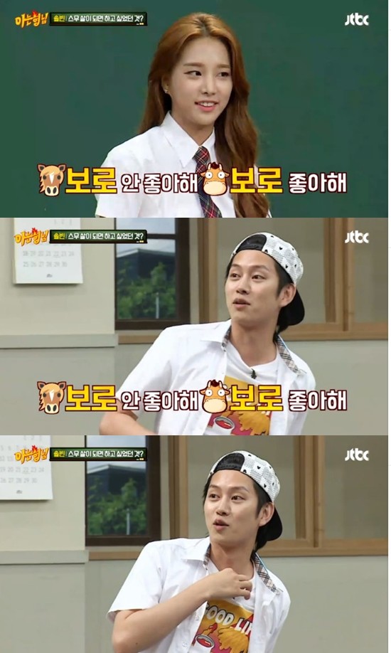 솔빈은 3일 방송된 JTBC 예능프로그램 ‘아는 형님’에서 일명 ‘아재 개그’로 재치 있는 입담을 선보여 멤버들을 매료시켰다.