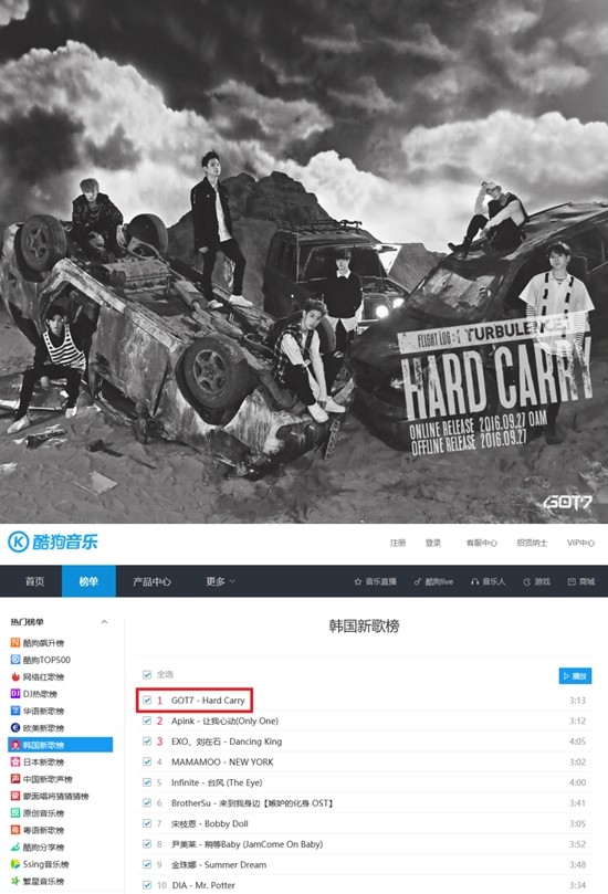 27일 공개된 갓세븐의 신곡 ‘하드캐리’는 발매 직후 중국 최대 음원사이트인 쿠고우 한국차트 1위에 올랐다.