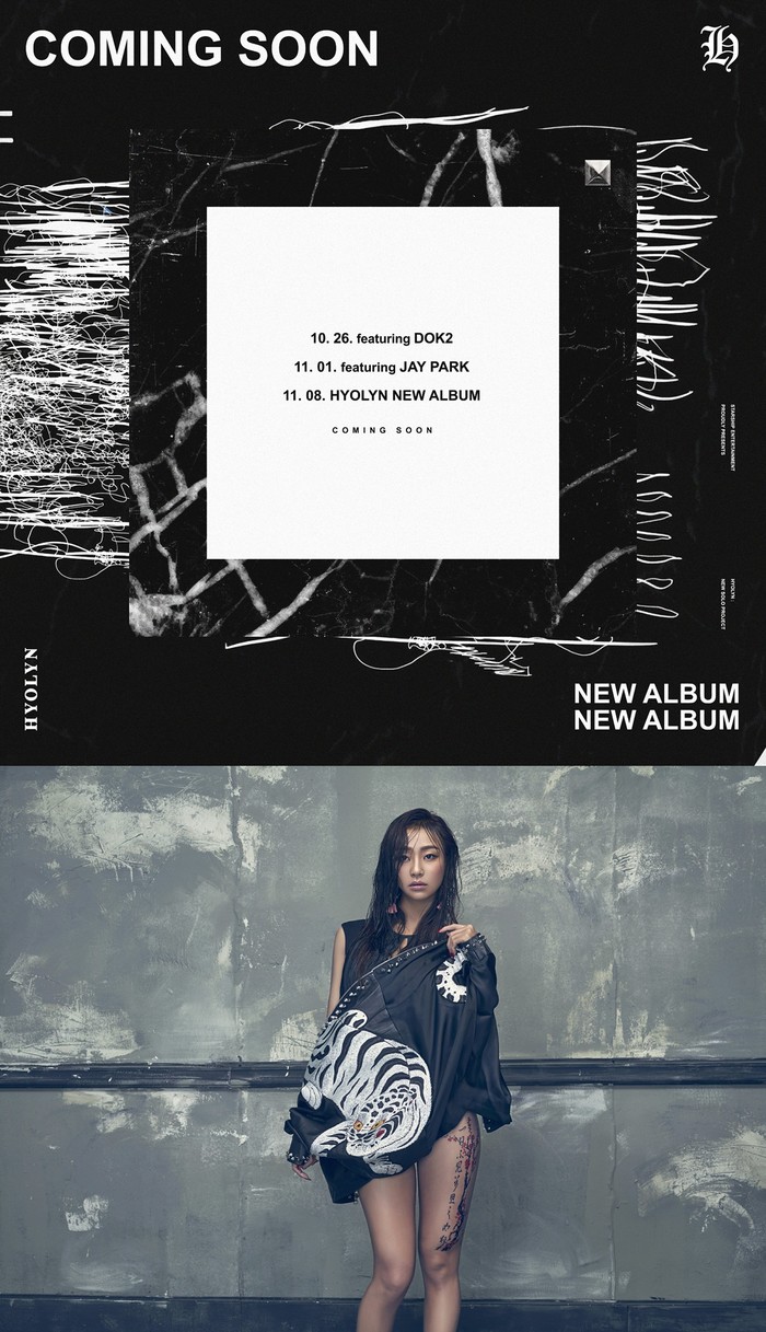 효린의 소속사인 스타쉽엔터테인먼트는 최근 공식 SNS에 "HYOLYN COMING SOON!"이라는 글과 함께 한 장의 이미지를 게재했다. 효린 측은 커밍순 이미지를 통해 "10.26 featuring.DOK2 / 11.01 featuring.JAY PARK / 11.08 HYOLYN NEW ALBUM "라는 컴백일정과 피처링 라인업을 밝히며 시선을 사로잡는다.