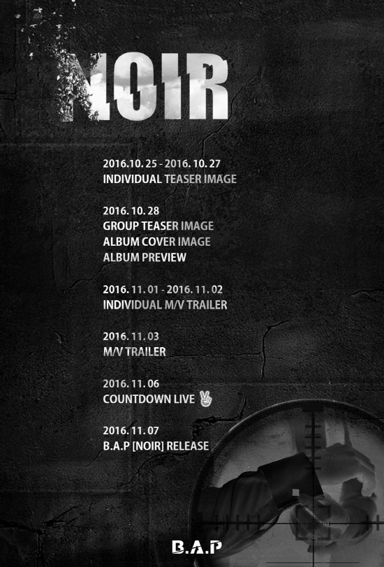 이들의 소속사 TS 엔터테인먼트 측은 B.A.P의 공식채널을 통해 ‘B.A.P 2nd full album <NOIR> Schedule Poster’라는 문구와 감각적인 컴백 스케줄 포스터를 게재했다.