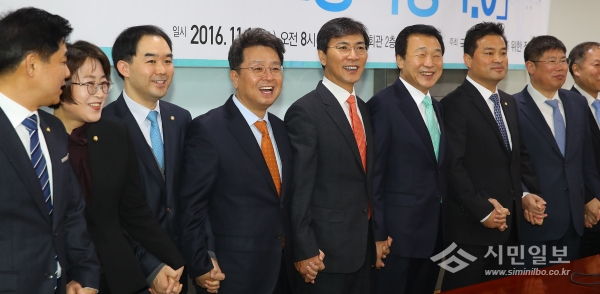 | ▲ 손학규 전 민주당 대표(오른쪽에서 네번째)과 안희정 충남도지사(오른쪽 다섯번째)가 16일 오전 국회에서 열린 야3당 초선의원들로 구성된 모임인 '따뜻한 미래를 위한 정치기획' 토론회에서 기념촬영을 하고 있다.(사진제공=연합뉴스) |