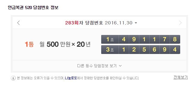 한편 283회차 당첨번호는 '1조491178' '3조125694'로 발표됐다.